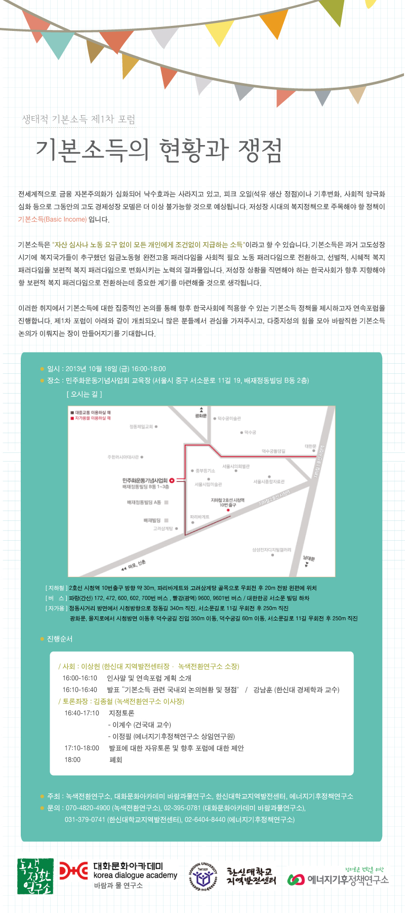 대화문화아카데미 생태적 기본 소득 제1차 포럼 -기본 소득의 현황과 쟁점 2013.10.11 조회수 : 24 공유하기 페이스북으로 공유하기 페이스북으로 공유하기 URL 녹색전환연구소, 대화문화아카데미 바람과물연구소, 한신대 지역발전센터, 에너지기후정책연구소 가 공동주최하는 제 1차 기본 소득 포럼에 많은 관심 바랍니다. 태그 기본 소득 이전 [개강임박] 영화, 철학, 예술, 소설창작, 프랑스어 등의 강좌가 10/7(월) 시작됩니다 다음 "한국 교회의 오래된 새길" 기획모임 목록으로