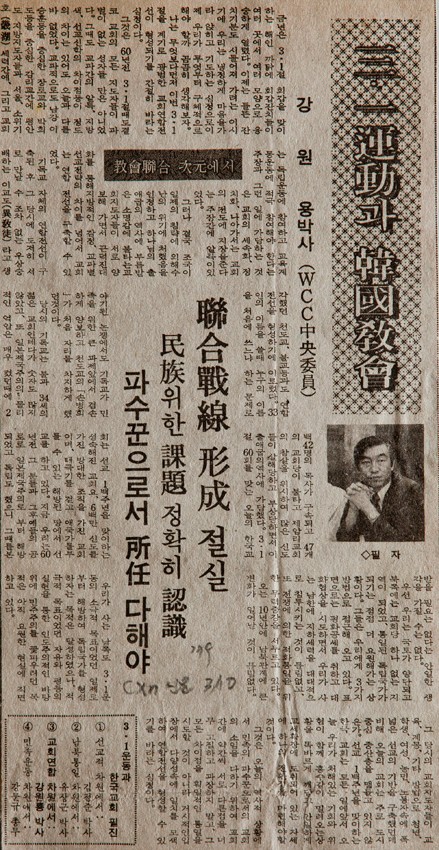 "3.1운동과 한국교회 : 교회연합 차원에서 작성일 : 2011.06.29 조회수 : 15 공유하기 페이스북으로 공유하기 페이스북으로 공유하기 URL 오늘의 역사적 상황에서 민족의 파수꾼으로서의 교회의 소임을 다하기 위하여 교회간에 약간씩 서로 다른 점을 고집하고 과장하지 말고, 모든 차이점을 획일적인 통일을 시도할 것이 아니라 거시적인 입장에서 다양성 속에 일치를 모색하여 연합전선을 형성할 수 있기를 바란다. 관련일시 1979.03.10 노트 크리스챤신문 태그 신문기사 이전 한신대 신입생을 위한 내일&리더십 캠프 다음 1차 멘토 포럼 목록으로