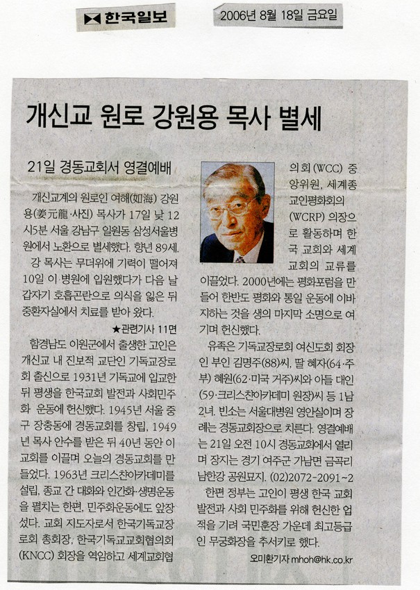 개신교 원로 강원용 목사 별세 (여해사업회011) 작성일 : 2011.06.29 조회수 : 12 공유하기 페이스북으로 공유하기 페이스북으로 공유하기 URL 정부는 고인이 평생 한국교회 발전과 사회 민주화를 위해 헌신한 업적을 기려 국민훈장 가운데 최고등급인 무궁화장을 추서키로 했다. 한편 영결예배는 21일 오전 10시 경동교회에서 열린다. 관련일시 2006.08.18 노트 한국일보 태그 신문기사 이전 한신대 신입생을 위한 내일&리더십 캠프 다음 1차 멘토 포럼 목록으로