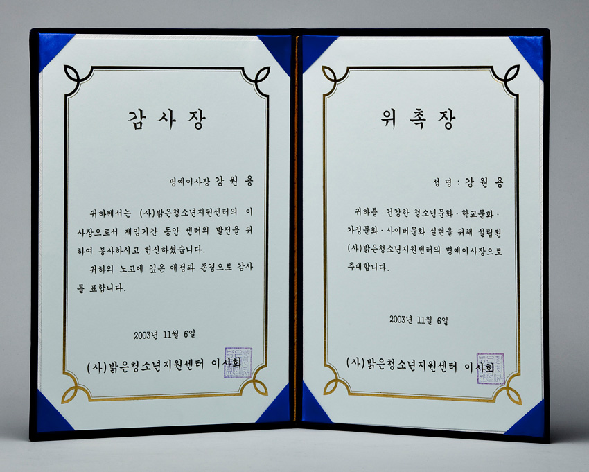 명예이사장 감사장 및 위촉장 - (사)밝은청소년지원센터 작성일 : 2011.06.29 조회수 : 45 공유하기 페이스북으로 공유하기 페이스북으로 공유하기 URL "(감사장) 귀하께서는 (사)밝은청소년지원센터의 이사장으로서 재임기간 동안 센터의 발전을 위하여 봉사하시고 헌신하셨습니다. 귀하의 노고에 깊은 애정과 존경으로 감사를 표합니다. (위촉장) 귀하를 건강한 청소년문화?학교문화?가정문화?사이버문화 실현을 위해 설립된 (사)밝은청소년지원센터의 명예이사장으로 추대합니다." 관련일시 2003.11.06 태그 각종상패 이전 한신대 신입생을 위한 내일&리더십 캠프 다음 1차 멘토 포럼 목록으로