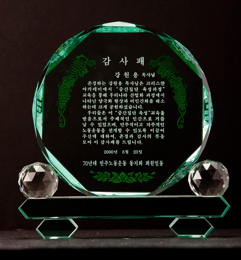 70년대 민주노동운동 동지회 회원일동 작성일 : 2011.06.29 조회수 : 21 공유하기 페이스북으로 공유하기 페이스북으로 공유하기 URL 존경하는 강원용 목사님은 크리스챤 아카데미에서 “중간집단 육성과정”교육을 통해 우리나라 산업화 과정에서 나타난 양극화 현상과 비인간화를 해소하는데 크게 공헌하셨습니다. 우리들은 이 “중간집단 육성”교육을 받음으로서 주체적인 인간으로 거듭날 수 있었으며, 민주적이고 자주적인 노동운동을 전개할 수 있도록 이끌어 주신데 대하여, 존경과 감사의 뜻을 모아 이 감사패를 드립니다. 관련일시 2000.05.23 태그 각종상패 이전 한신대 신입생을 위한 내일&리더십 캠프 다음 1차 멘토 포럼 목록으로