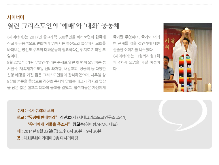 [사이너머 77호] 삶의 이야기, 진실에 다가가기 2014.09.19 조회수 : 35 공유하기 페이스북으로 공유하기 페이스북으로 공유하기 URL 이전 [사이너머 76호] 녹색의 힘을 어떻게 키워갈 것인가? 다음 [사이너머 78호] 우리는 행복한가? 목록으로
